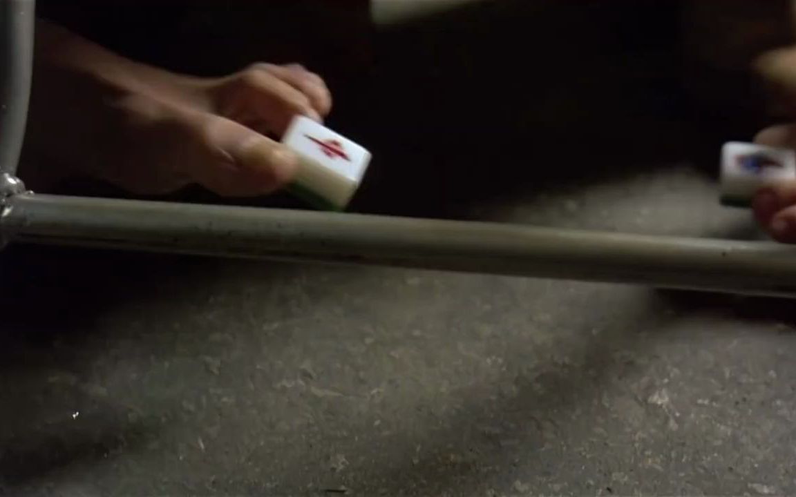 رجل يخفي ورقة لعب في راحة يده أثناء لعبة الماهjong، لكنه تم القبض عليه على الفور