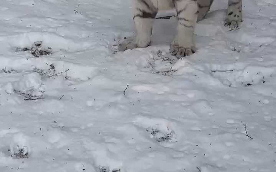 النمر الأبيض الصغير يستخدم فضلات القطط لأول مرة