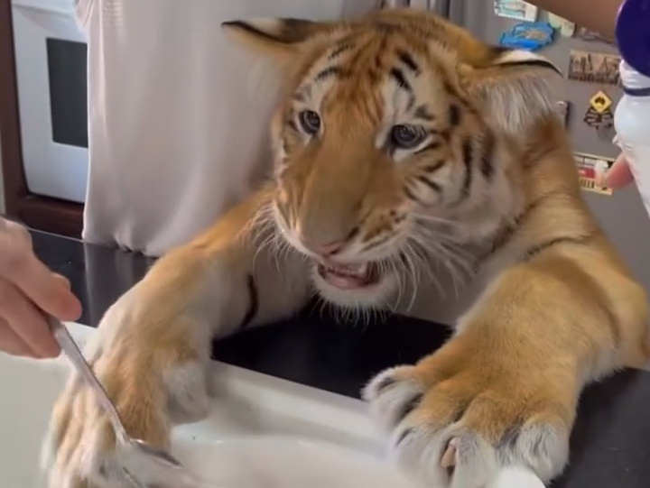 ارتجفت حدقات القط من الدهشة عندما رأى نمرًا لأول مرة