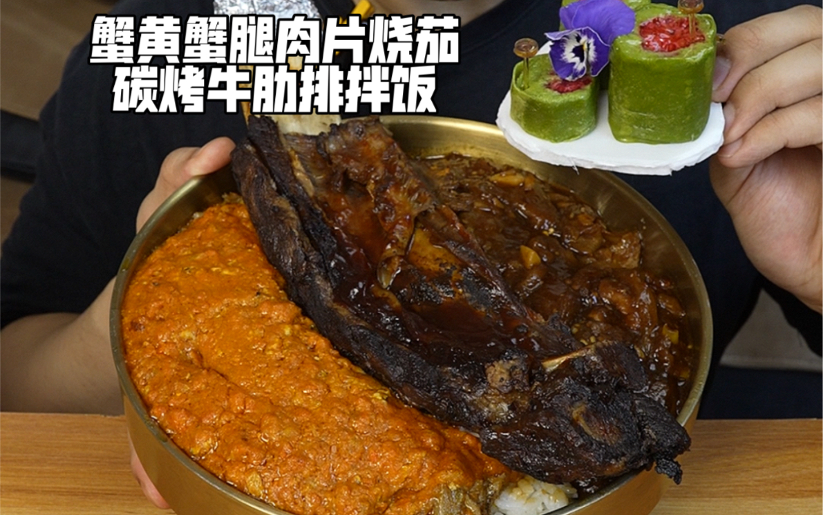 صندوق باذنجان مقلي بنكهة السمك، أرز لحم الخنزير المطهو ببطء، لحم بقري ولفائف فطر إينوكي