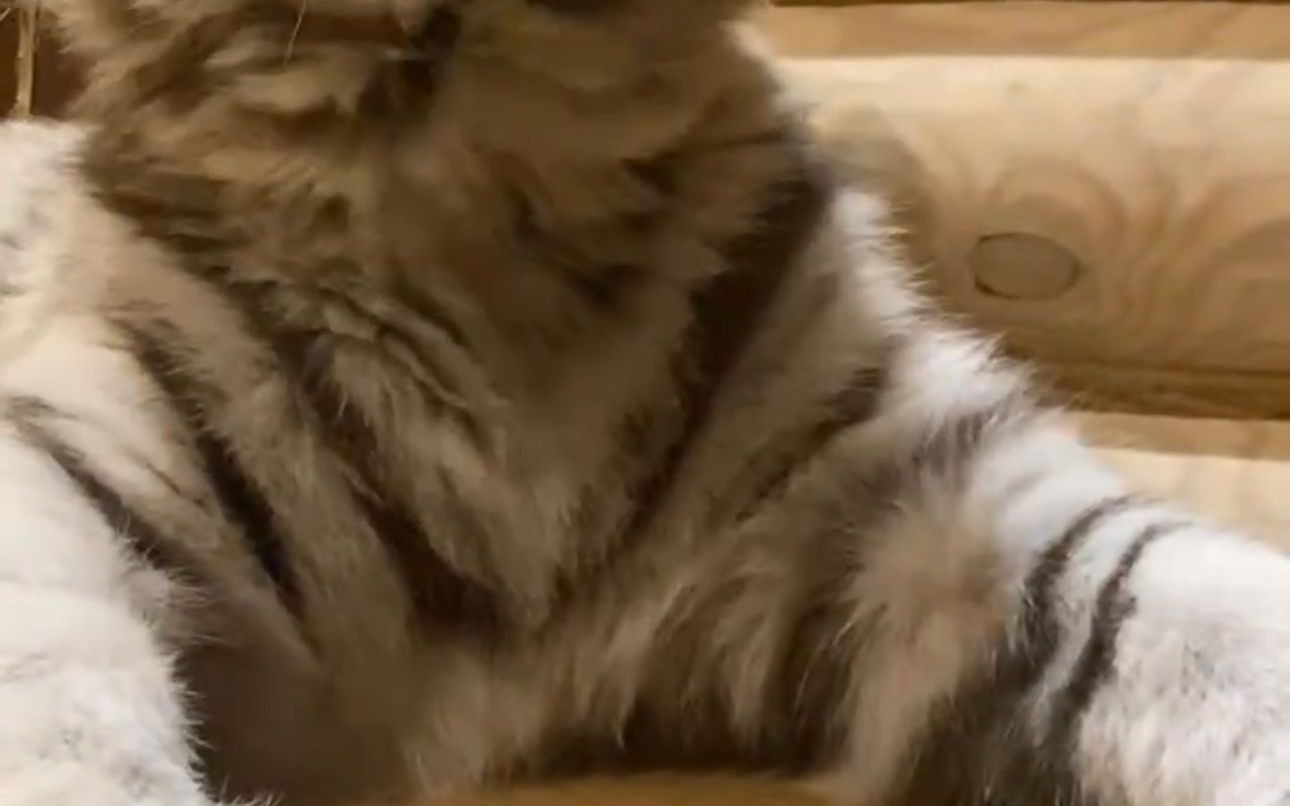 النمر الأبيض الصغير يستخدم فضلات القطط لأول مرة