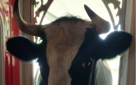 داعب صاحب البقرة القطة دون أن ينتبه إلى البقرة، فغضبت البقرة وأصبح من الصعب إقناعها قليلاً.