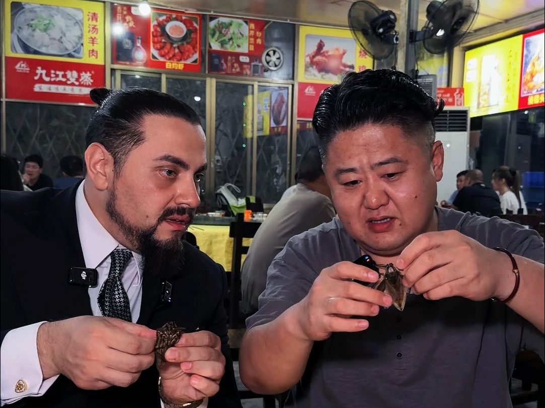 مراجعة لتحدي الأجانب لسلسلة المشروبات الكحولية الصينية. شربوها بشغف عميق، وزبد الأخ الأسود في فمه.