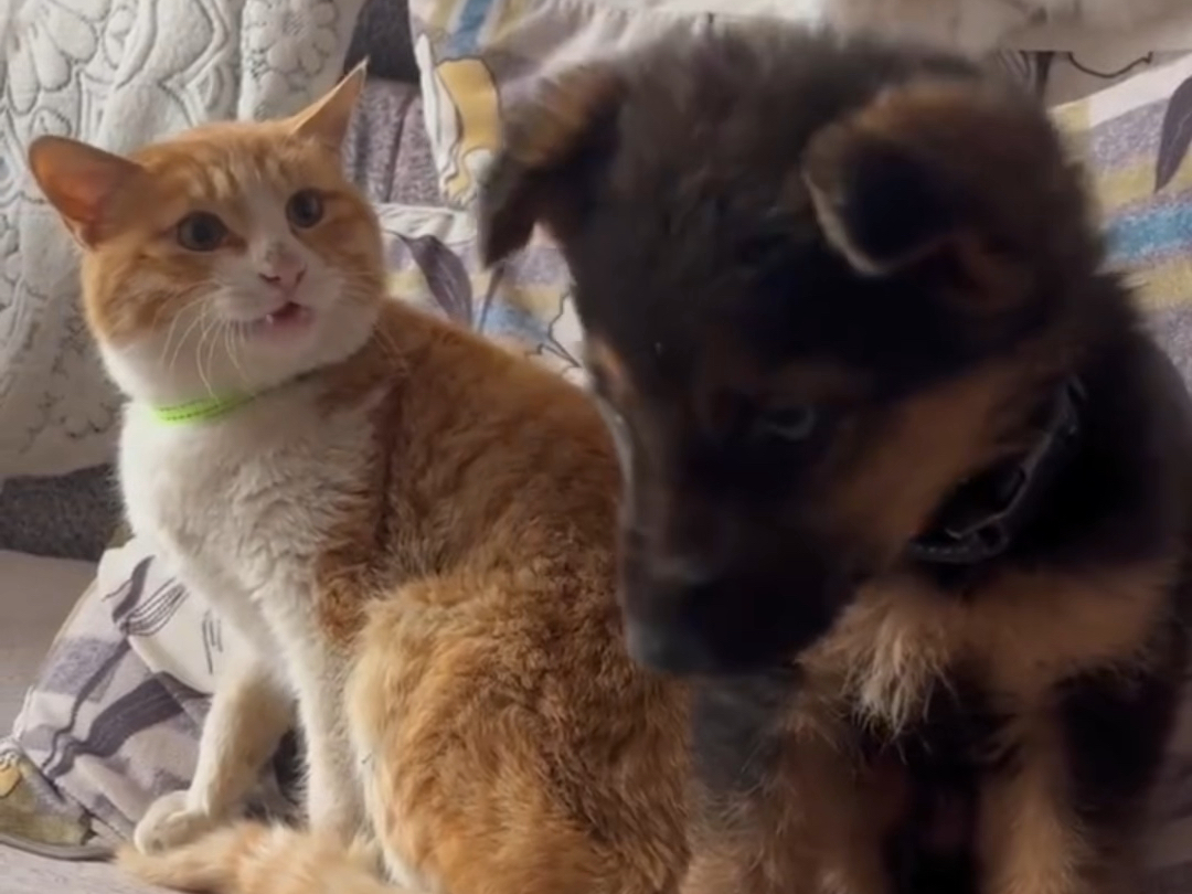 بينما كان المالك يُعلّم الجرو الجديد نزول الدرج، خرجت القطة من المنزل وتطوعت طواعية لتكون المعلمة أي