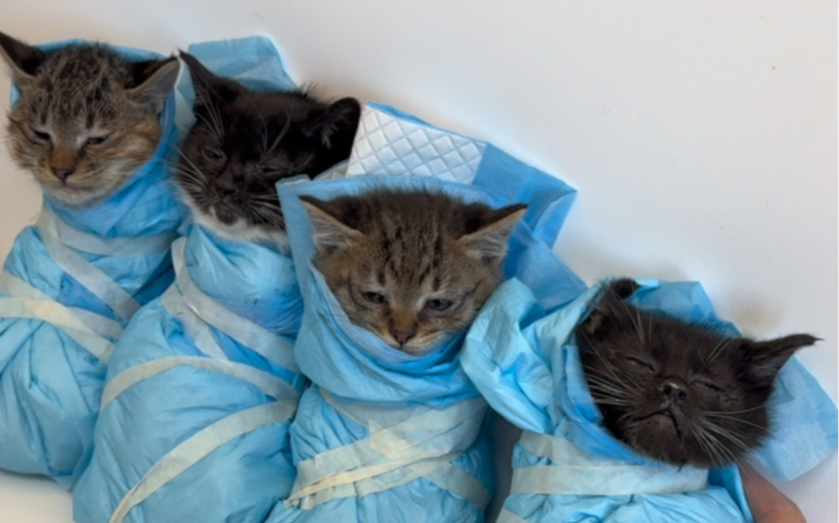 وُلدت مجموعة من القطط الصغيرة في المطر الغزير، وكان أحدهم واقفًا ورقبته