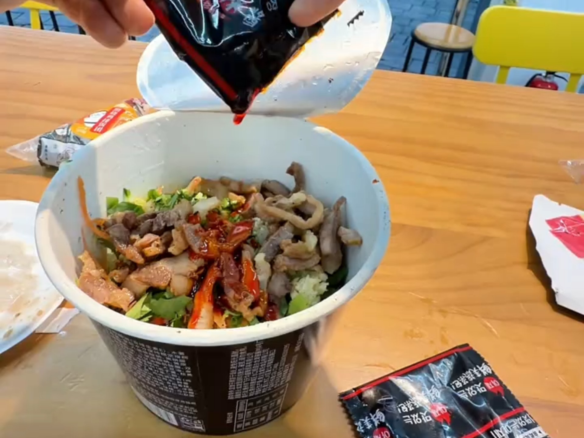 لحم مقطع مع الخضار، شرائح لحم مقلية، لفائف الروبيان المقرمشة