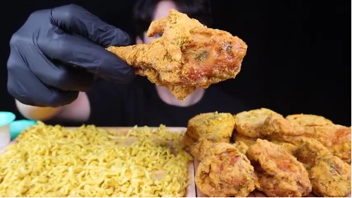 ASMR EATING SPICY NOODLES, MOMOS, HALF FRIED EGG AND FRIED CHICKEN🩷