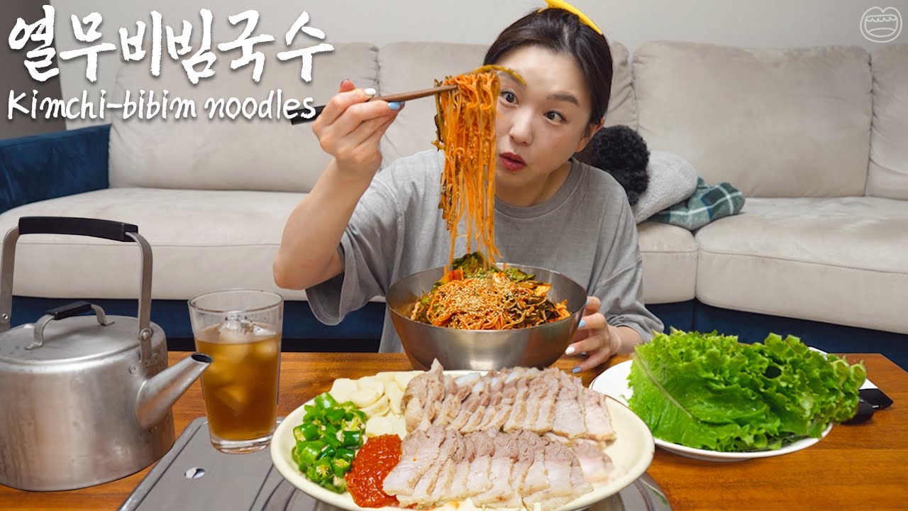 Real Mukbang:) Fried soy sauce pork & beer! 🍺 ☆ Korean Spicy Kimchi Bibim Noodles