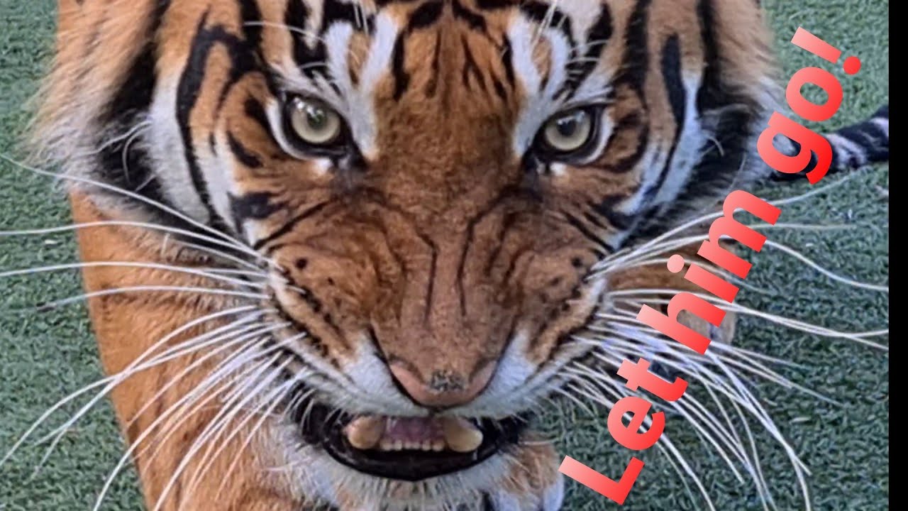 Tiger tasting pizza meat! and preventing cars from driving through wall!