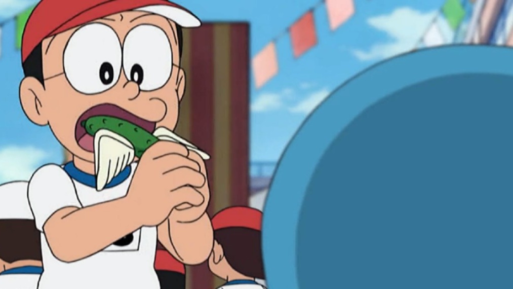 Doraemon's son travels through time to find Nobita, angrily scolding him for not being a good father