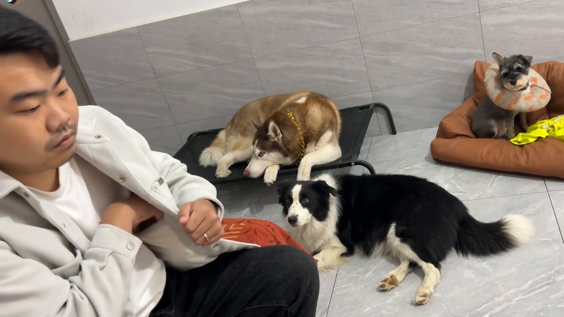 There is a pot of meat next to the "tiger". Border Collie VS Husky, who dares to eat it?