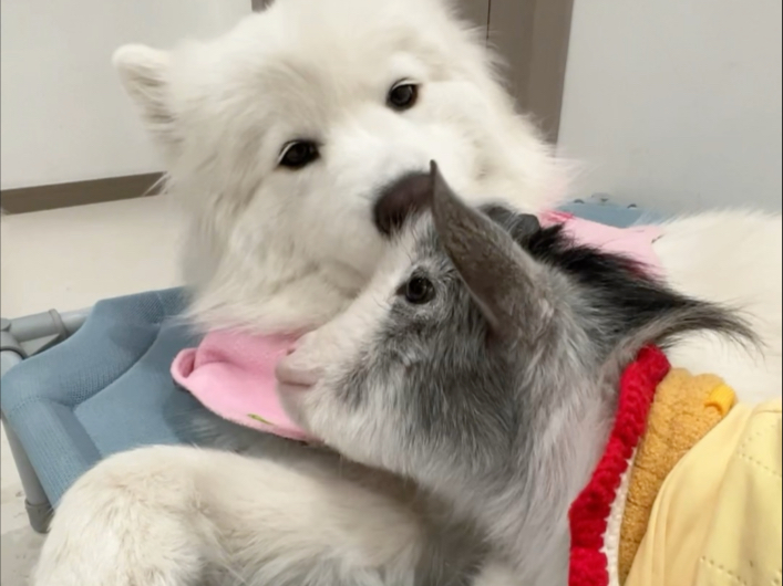 The Samoyed puppy starts eating. The dog's mother has been gone for a long time and she is lost. As