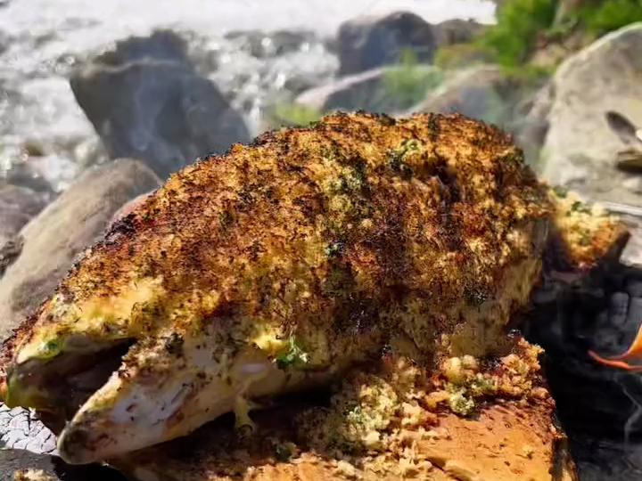 Delicious food by the Tarim River in Xinjiang, grilled fish with red willow in the desert