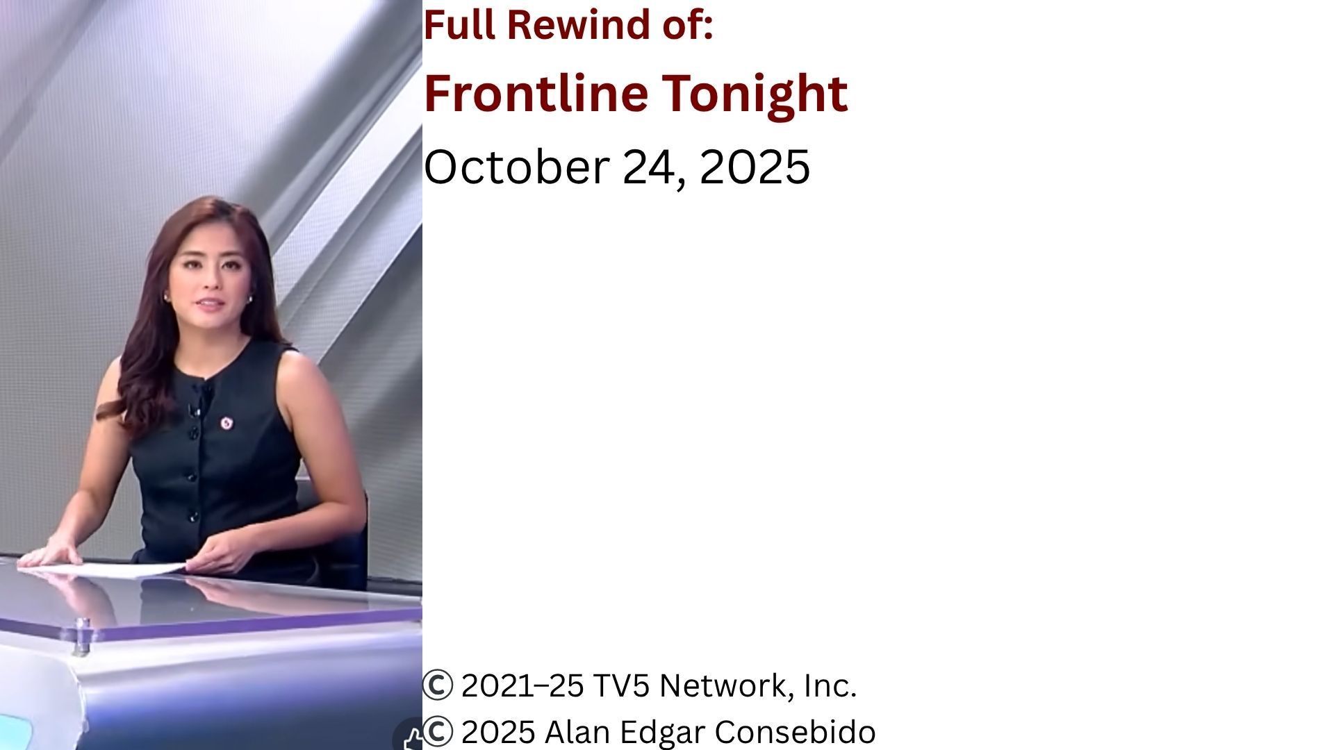 Balikan ang mga balitang tampok sa Frontline Tonight noong Biyernes, Oktubre 24, 2025. ๐Ÿ“Œ๐“๐ž๐ซ๐ฆ๐ฌ ๐จ๐Ÿ ๐ฎ๐ฌ๐ž: ๐Ÿ“Œ๐ƒ๐ข๐ฌ๐œ๐ฅ๐š๐ข๐ฆ๐ž๐ซ: This program and episode contains copyrighted material owned by TV5 Network, Inc. in the Republic of the Philippines. It is shared solely for purposes of public interest, education, commentary, and appreciation, with no intent to infringe, pirate, or violate the rights of any copyright holders. Full credit and acknowledgment were extended to the rightful owner of this media used. ---------------------------------------------------------------------------------------------------------- Copyright Disclaimer Under Section 107 of the Copyright Act 1976, allowance is made for "fair use" for purposes such as criticism, comment, news reporting, teaching, scholarship, and research. Fair use is a use permitted by copyright statute that might otherwise be infringing. Non-profit, educational or personal use tips the balance in favor of fair use. ยฉ๏ธ 2021โ€“25 TV5 Network, Inc.