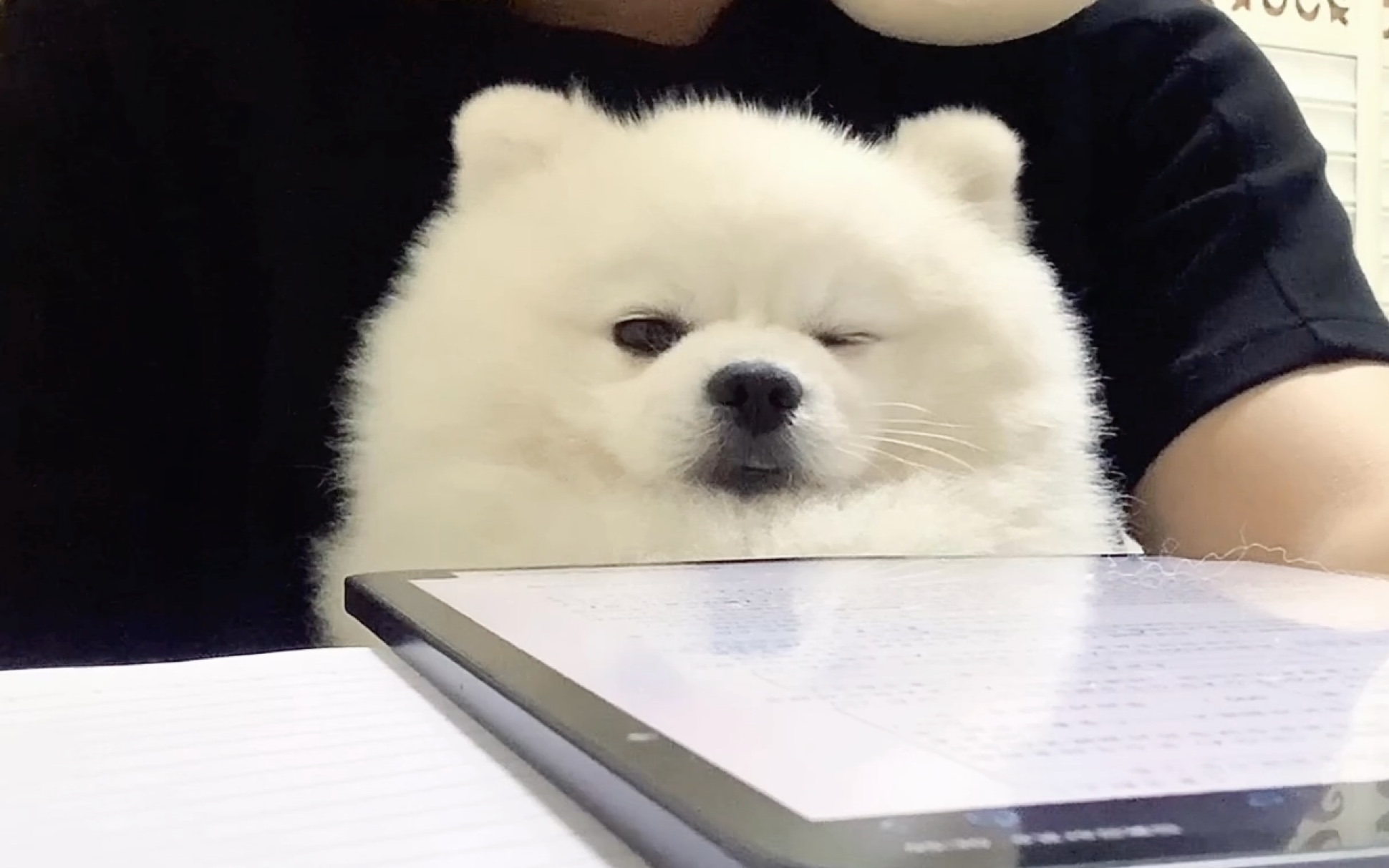 The Pomeranian dog eats sausage rice cake and pork rice cake online. It’s so delicious to chew!