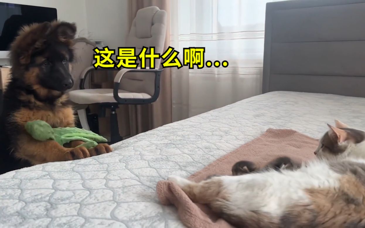 German Shepherd's reaction to the bunny