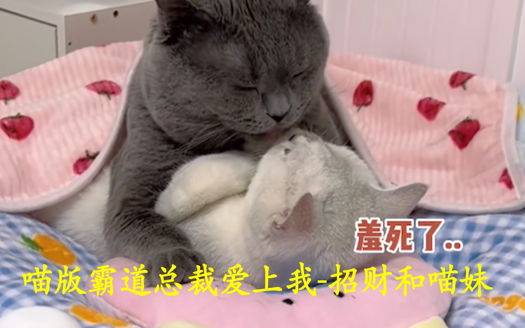 The picked-up cat competes with human cubs for pillows and grows up.