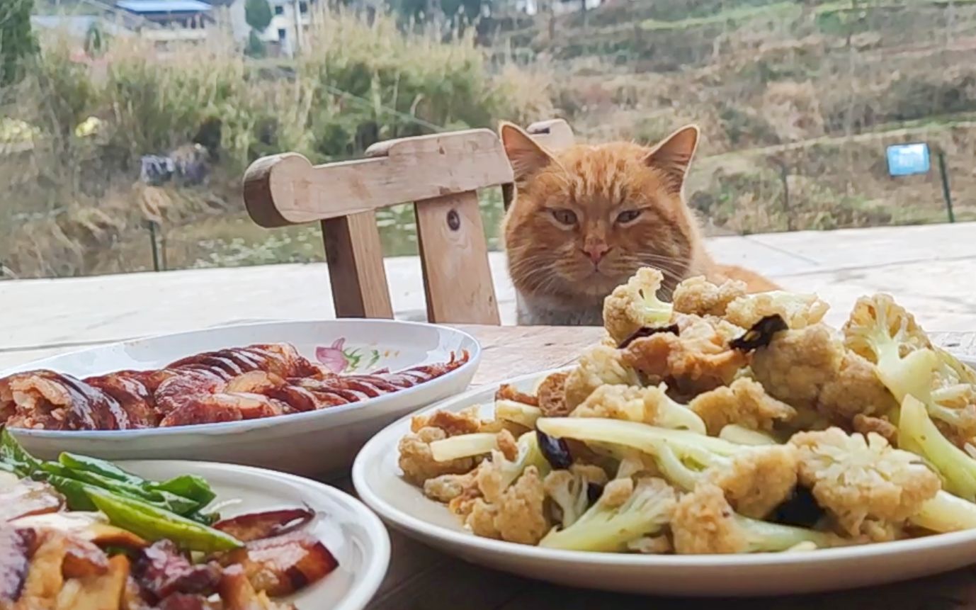 The garden is full of delicious food, and an orange cat comes out of the wall. [bilibili annual cat