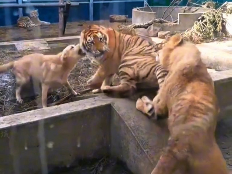 The pit bull provoked the tiger, but the tiger choked him and sent him home. Tiger: Where does the c