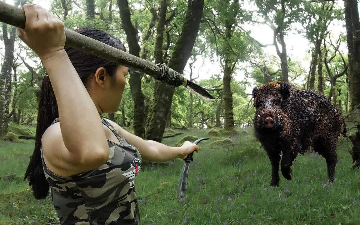 Hunting wild boar with compound bow, the wild boar died on the spot