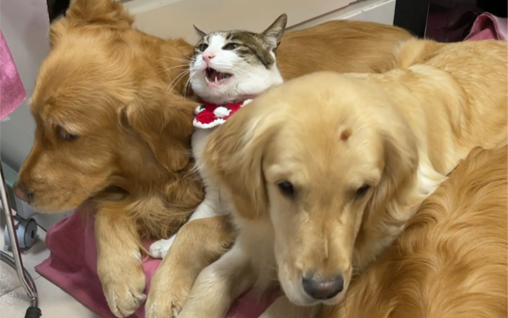 Worried about the cat scratching the child, the child calls the dog to bring the cat back