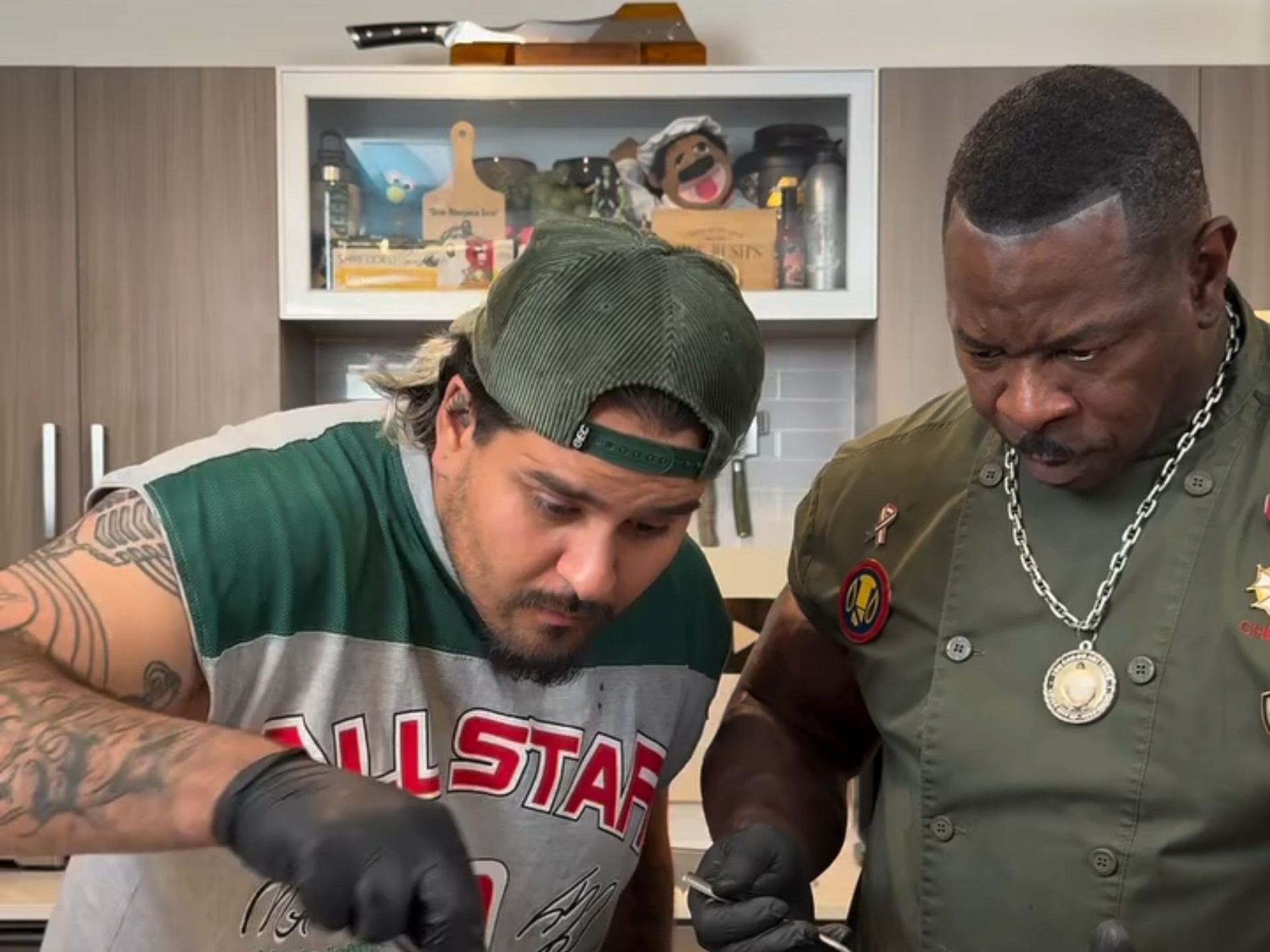 The barber trims the customer's dreadlocks and adds a "knife-cut" hairline after the cut