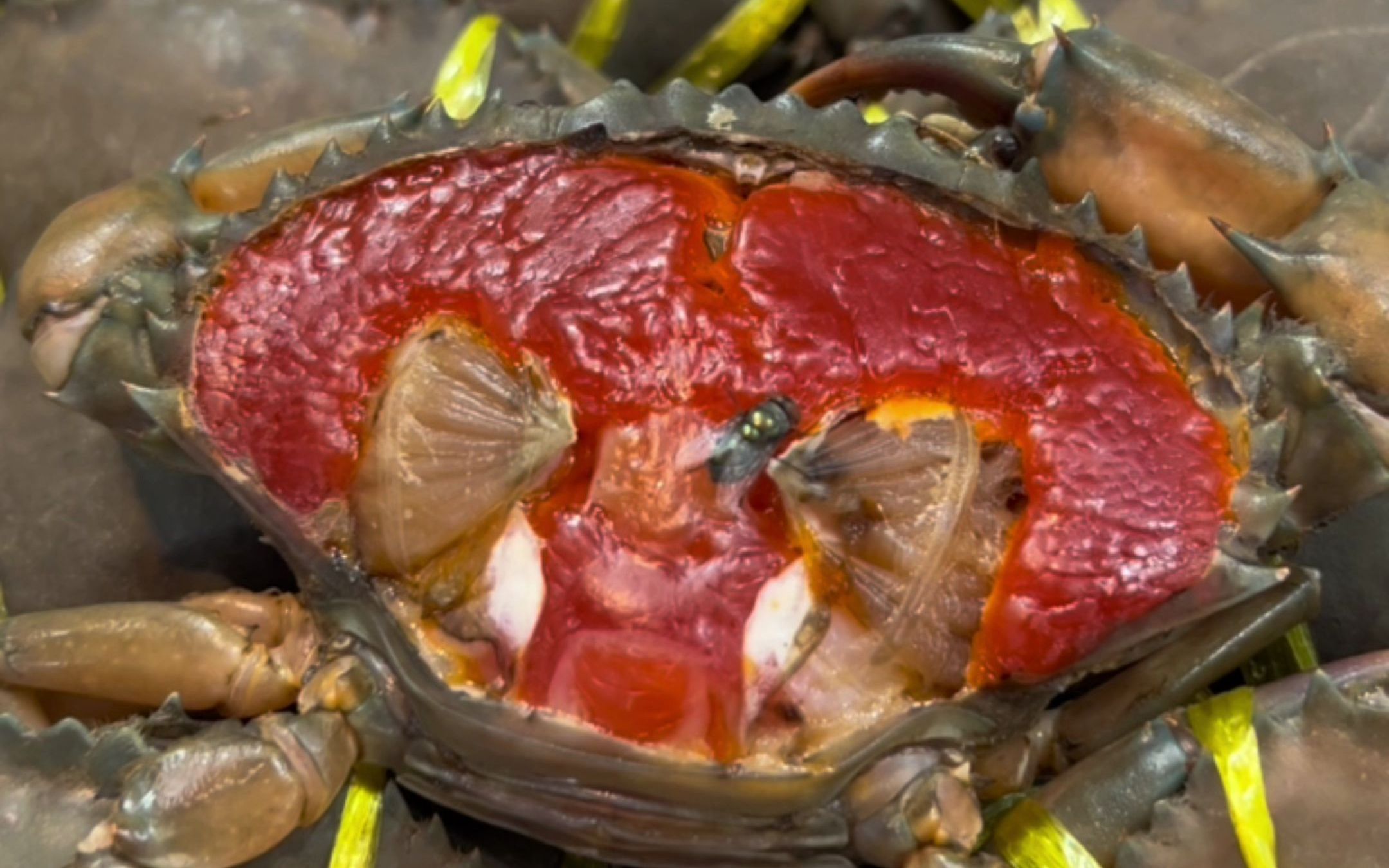 The raw pickled crab is strong, and it is all yellow when it is broken open