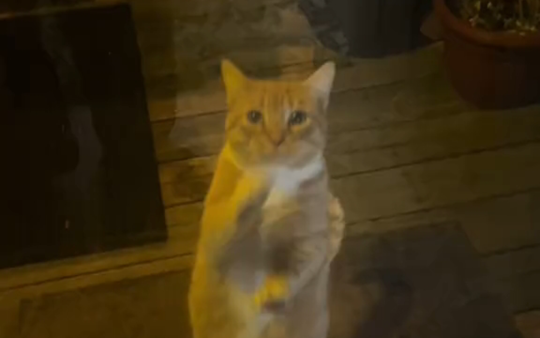 The orange cat was shocked to see the dry rice cat!