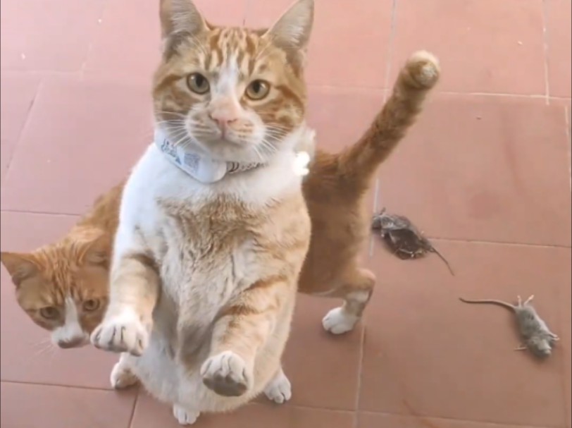 This mother cat exchanges her children for sausages