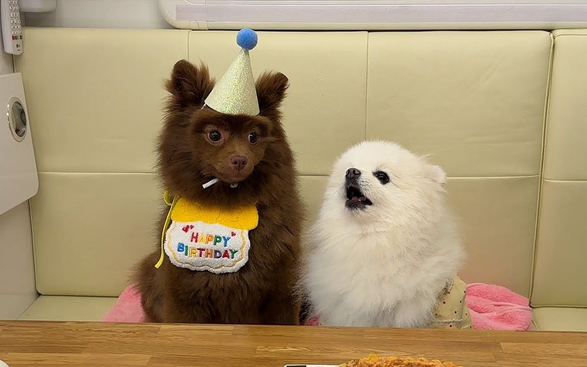 The Pomeranian dog eats sausage rice cake and pork rice cake online. It’s so delicious to chew!