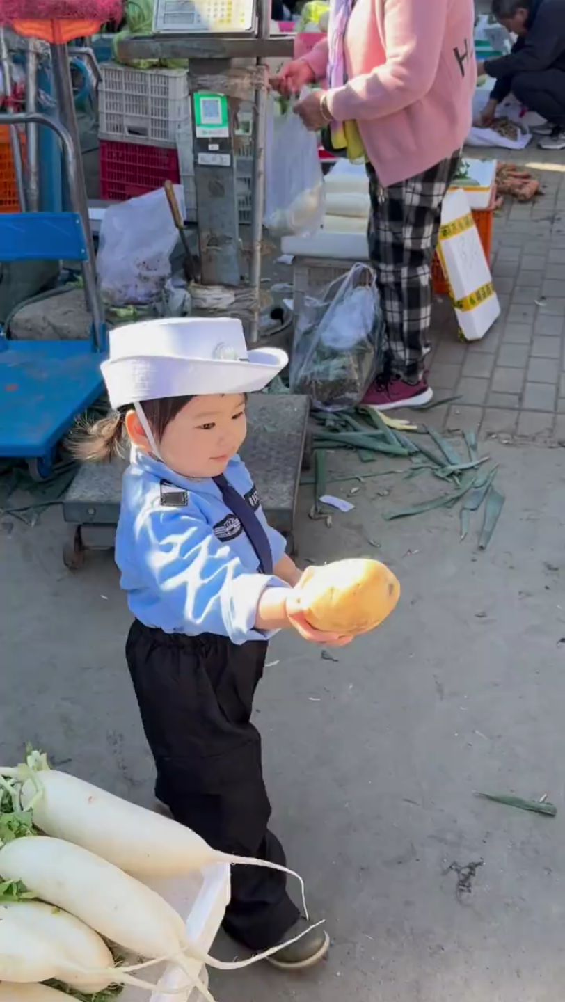 Blowing wind on her head, she looks like a dandelion.