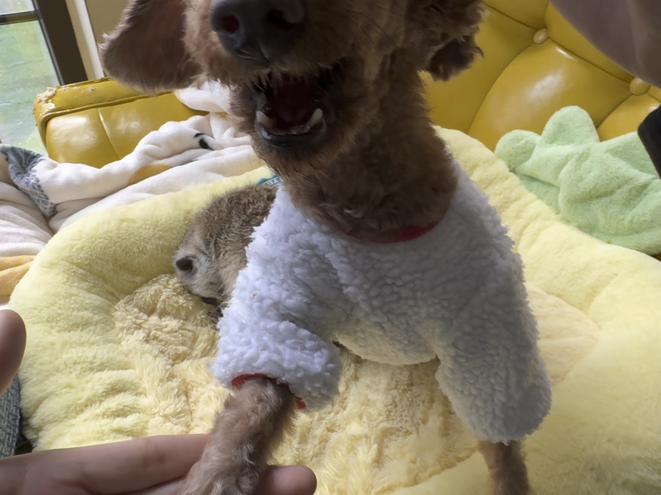 The puppy was so nervous when it was getting its hair trimmed for the first time~ His little tongue