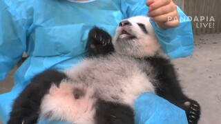 [Hewan] Seekor panda sedang makan dengan botol susu dan celemek