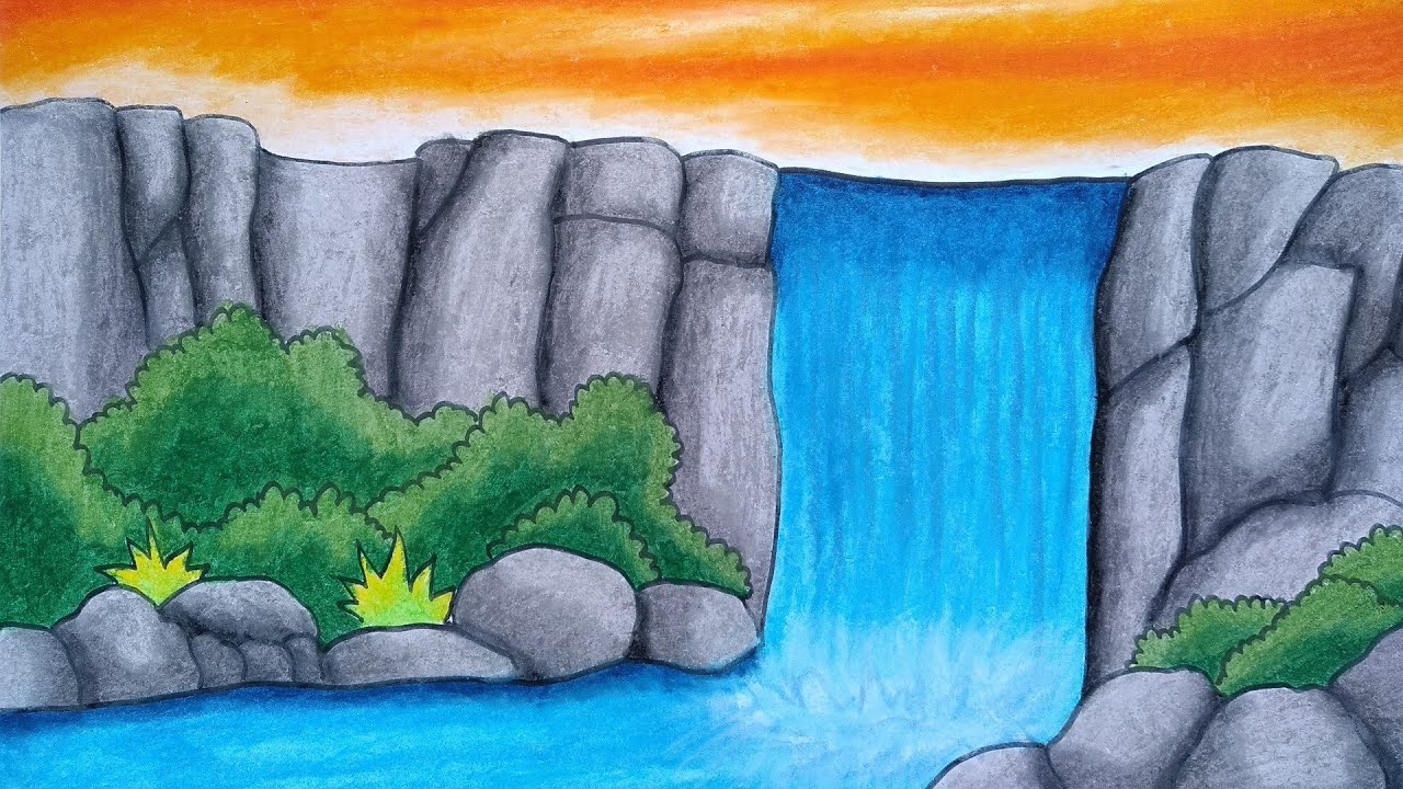 Menggambar pemandangan air terjun || Cara menggambar dan mewarnai pemandangan alam