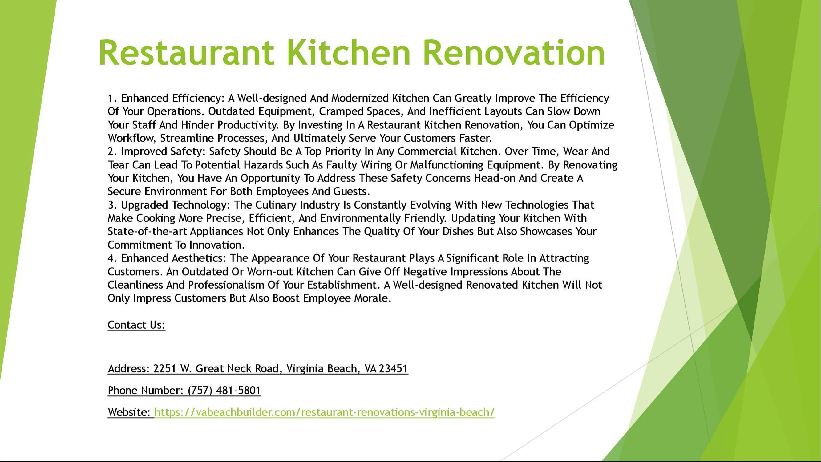 After construction is complete, focus on selecting high-quality equipment that aligns with your menu offerings and operational needs. Invest in energy-efficient appliances that can save you money in the long run while reducing your carbon footprint. Visit: https://vabeachbuilder.com/restaurant-renovations-virginia-beach/