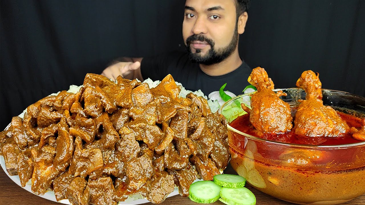HUGE SPICY MUTTON FAT CURRY, WHOLE CHICKEN CURRY, CHICKEN GRAVY, RICE, SALAD ASMR MUKBANG EATING ||