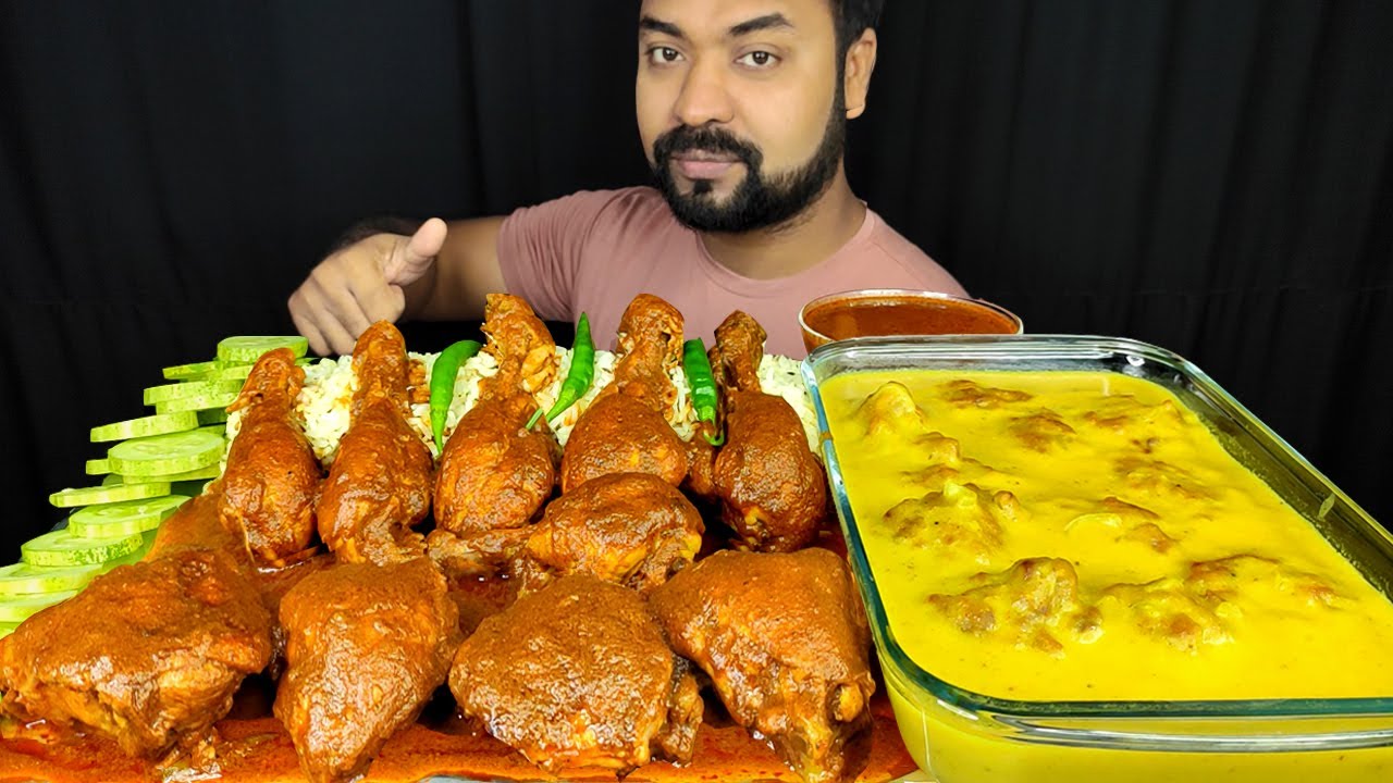 SPICY CHICKEN LEG PIECE CURRY, SUNNY SIDE UP EGG CURRY, CHANA PULAO, SALAD MUKBANG EATING| BIG BITES