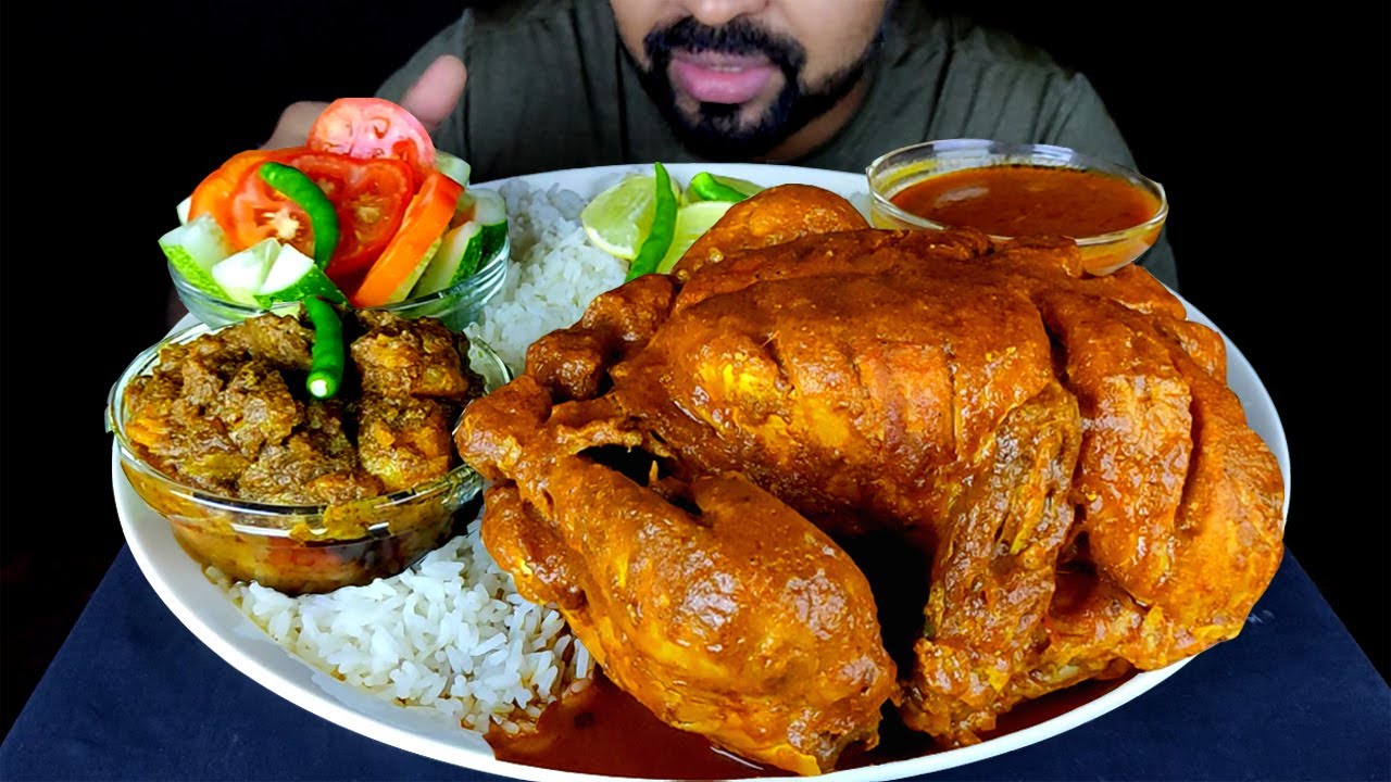 SPICY WHOLE CHICKEN CURRY, HUGE EGG CURRY, PAKORA, GRAVY, RICE, SALAD ASMR MUKBANG EATING SHOW ||