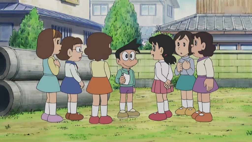 Nobita, Suneo, dan Doraemon memakan 100 potong roti kenangan.