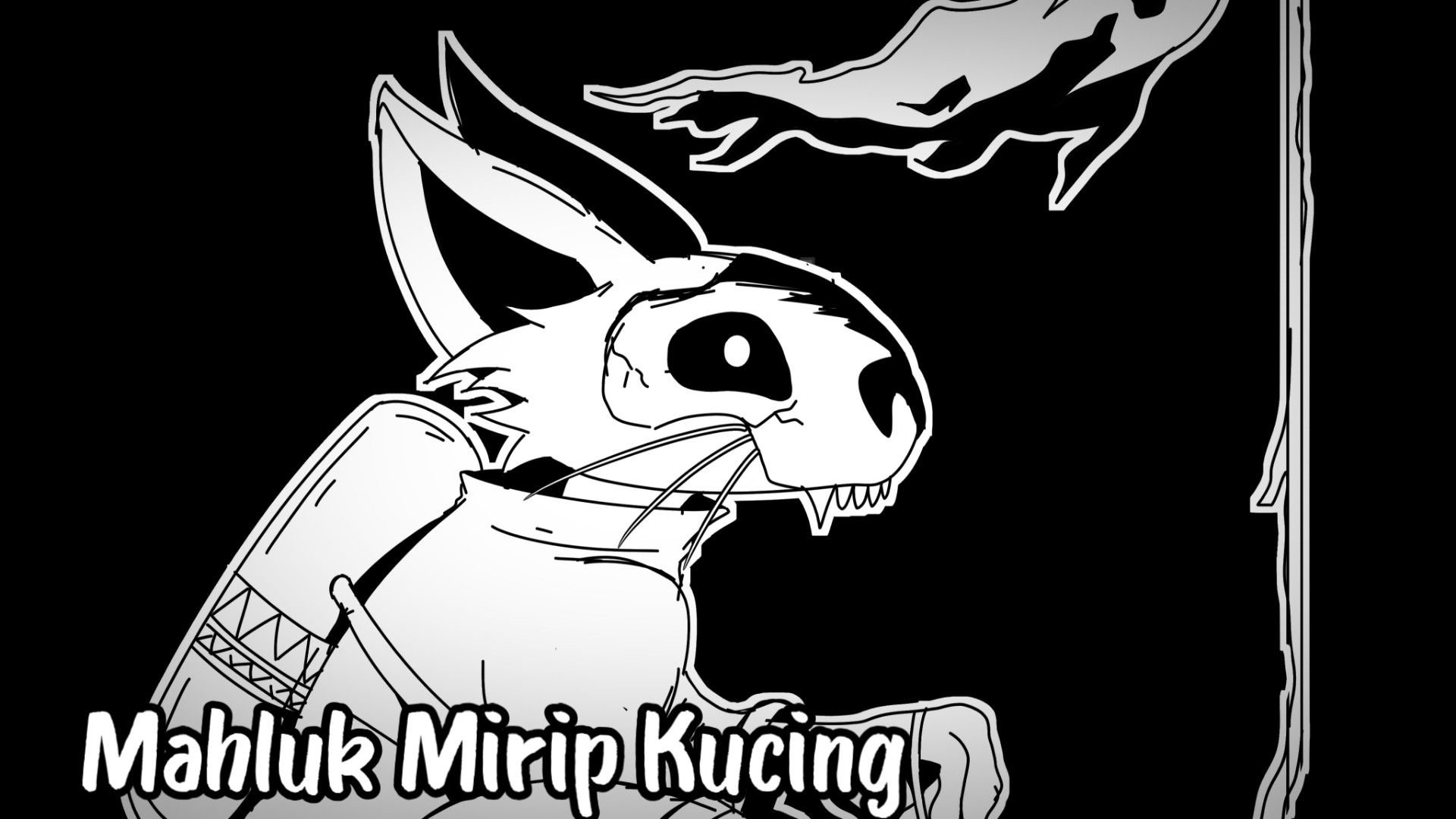 Sesosok Mahluk Menyerupai Kucing Sedang Duduk Sambil Memegang Tongkat