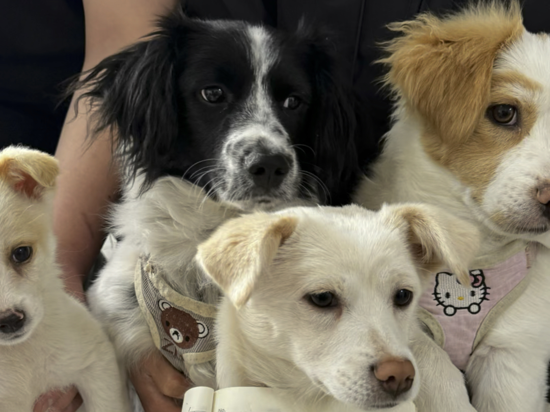 Anjing putih kecil ini membawa tiga teman baru untuk makan hot pot pedas, dan sudah ada sembilan anj