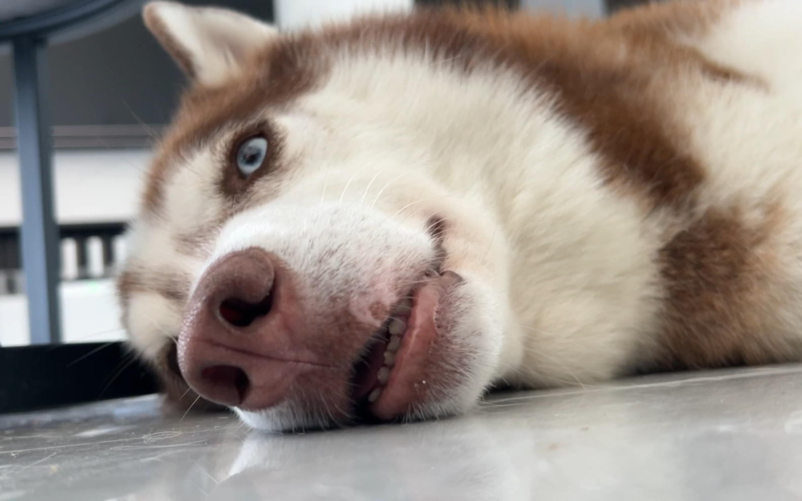 Memakai kostum dinosaurus mengagetkan Husky, bagaimana ekspresinya?