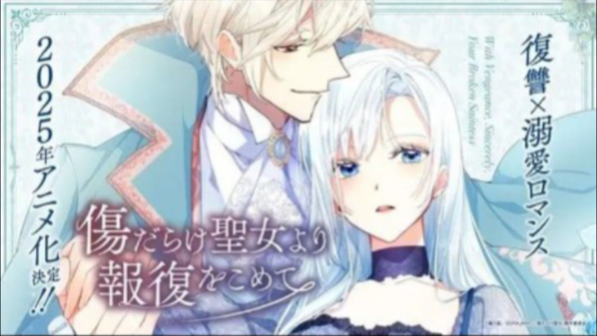 Kizu Darake Seijo Yori Houfuku wo Komete (傷だらけ聖女より報復を込めて) Judul Inggris: With Vengeance, Sincerely, Your Broken Saintess Genre: Fantasi, Romance Sinopsis: Lua adalah seorang calon santa yang memiliki kekuatan penyembuhan. Namun, kekuatannya ini memiliki kelemahan fatal: setiap kali dia menyembuhkan orang lain, luka-lukanya akan berpindah ke tubuhnya sendiri. Karena itu, dia dijauhi dan dicap sebagai "Saintess yang Gagal" atau "Fallen Saintess". Meskipun begitu, Lua tidak terlalu peduli karena dia memiliki sahabat karib bernama Arianne yang selalu membelanya. Suatu hari, kekasih Lua, Komandan Garrett, terluka parah akibat serangan monster. Lua dengan rela hati menggunakan kekuatannya untuk menyelamatkannya, meskipun harus mengorbankan dirinya sendiri. Namun, setelah sadar, Lua mendapati bahwa semua pujian atas kesembuhan Garrett diberikan kepada Arianne. Kejadian ini membuat Lua sadar akan pengkhianatan Arianne dan hatinya hancur. Di saat yang sama, seorang pangeran kedua yang misterius mendekatinya dan menawarkan bantuan. Lua pun memulai kehidupan barunya sebagai penjahat, penuh dengan dendam dan keinginan untuk membalas pengkhianatan. Lagu Pembuka: "DiZZY" oleh Reina Washio. Lagu Penutup: "Abyss" oleh Nonpy.