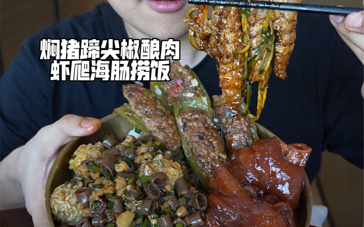 Ayam lada hitam, gurita pedas manis, kaki babi rebus, dan nasi dalam kaldu