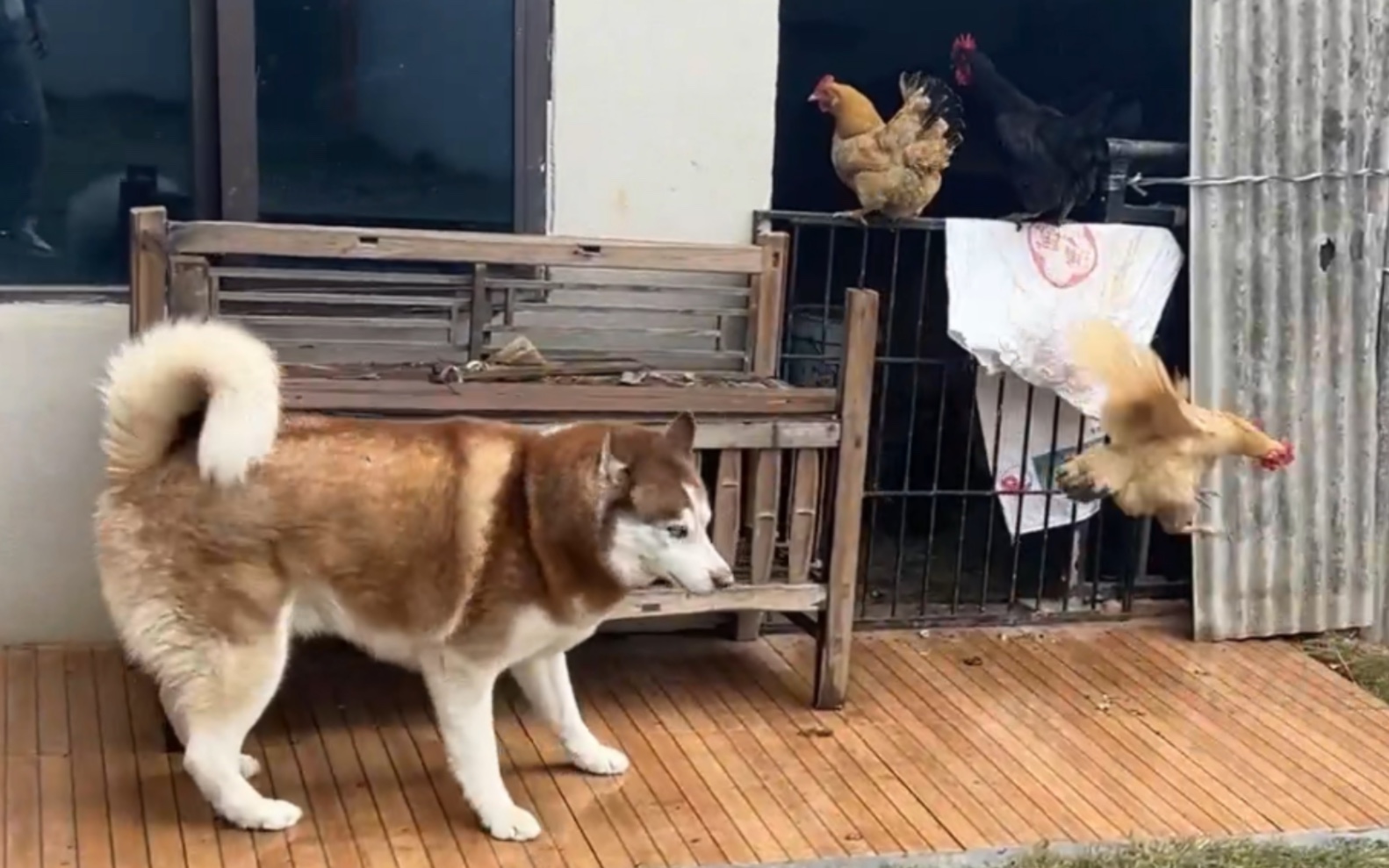 Memakai kostum dinosaurus mengagetkan Husky, bagaimana ekspresinya?