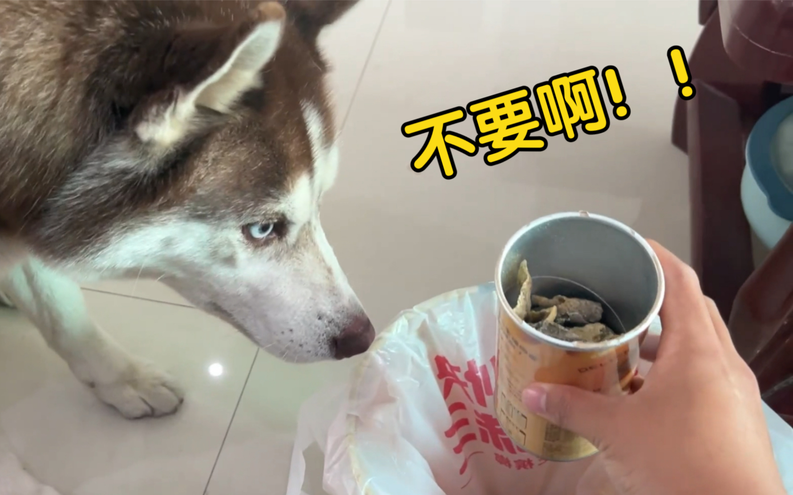Memakai kostum dinosaurus mengagetkan Husky, bagaimana ekspresinya?