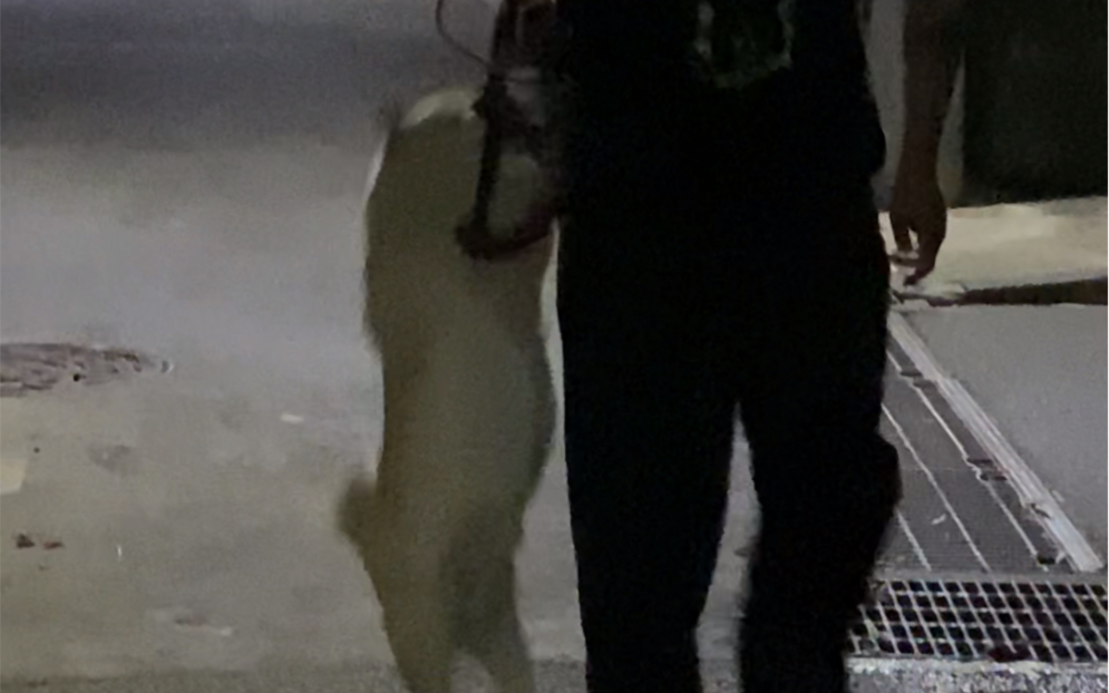 Anjing susu kecil itu sangat gila. Dia menjepitnya ke pintu dan hanya menyentuh kaki dan kakinya, me