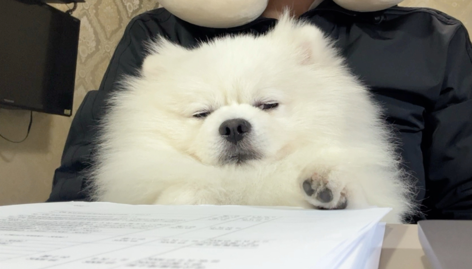 Anjing Pomeranian makan kue beras sosis dan kue beras babi secara online, enak sekali dikunyah!