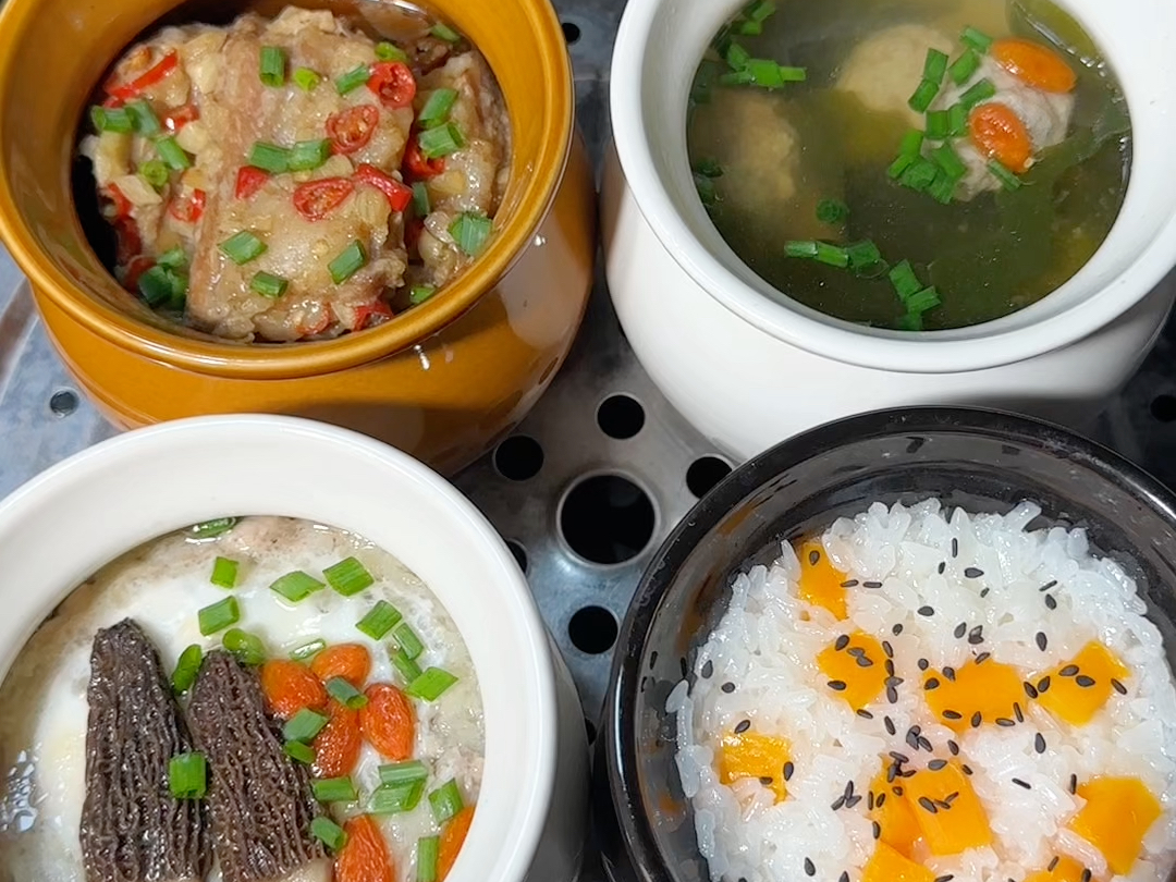 Tiga lauk sederhana dan satu sup, hidangan sederhana dengan teh biasa. Aroma kehidupan sehari-hari d