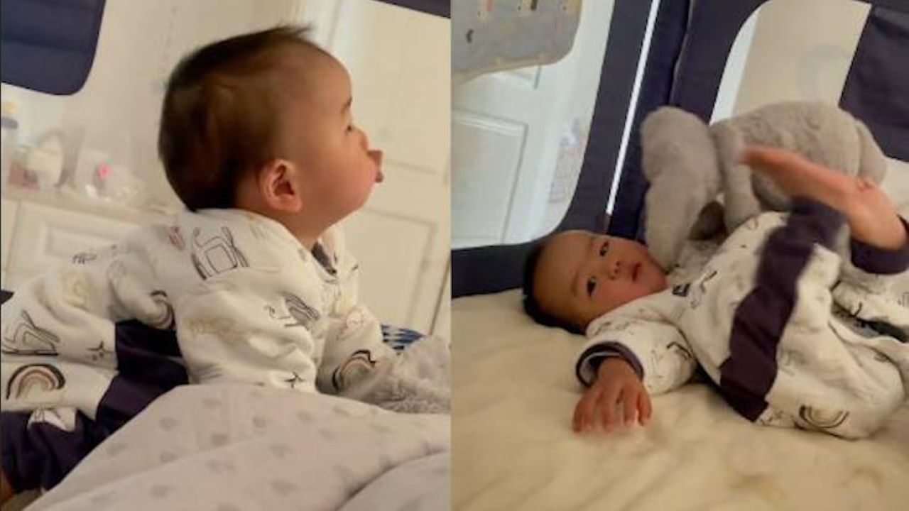 Bayi manusia yang berusaha menarik perhatian Mama setelah bangun tidur